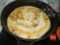 2. 将擀好的饼皮放入锅中,中小火烙至两面金黄酥脆。